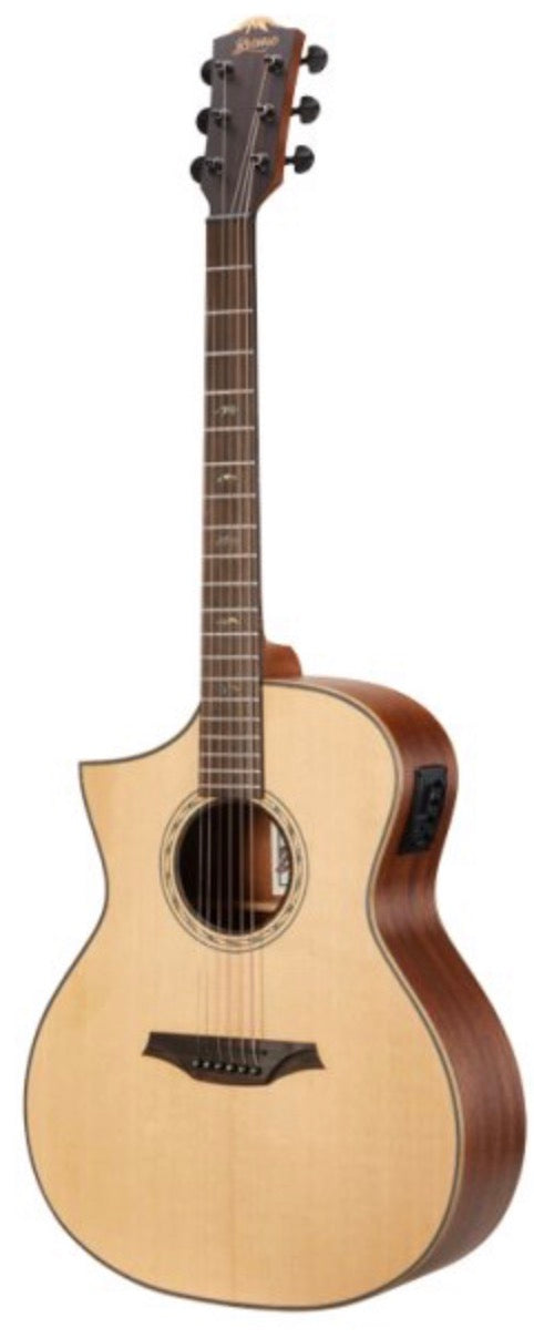 Presenting the Hillside Auditorium C guitar, boasting a scale of 648 mm (25 1/2") and a Nut Width of 43 mm (1 11/16"), offering exceptional comfort and playability. The Solid Spruce top, fortified with patented 'ToneFlow' bracing, combined with Mahogany back & sides, delivers a balanced and resonant sound profile. Maple multi-layer body binding and Rosewood purfling complement the body design, while the Amara Ebony fingerboard showcases the distinguished Mt. Bromo Abalone inlays. Detailed 'Cowboy Rope' and 'Eagle Wing' adornments enhance both the soundhole and bridge, adding aesthetic appeal and functionality. Additionally, equipped with a Nubone XB nut & saddle, diecast machine heads, and a satin finish, this guitar offers premium craftsmanship. Featuring a 3-Band EQ Preamp, the 'Bromo' BZP1 electronics ensure versatility and exceptional amplification for an all-around stellar performance.