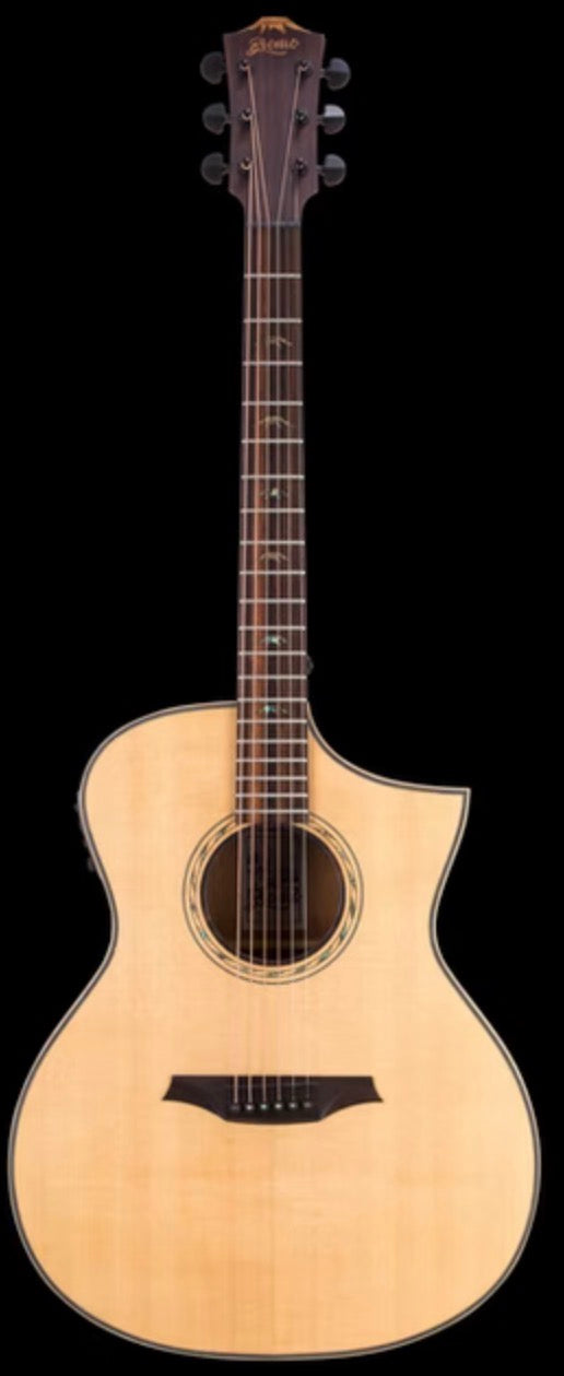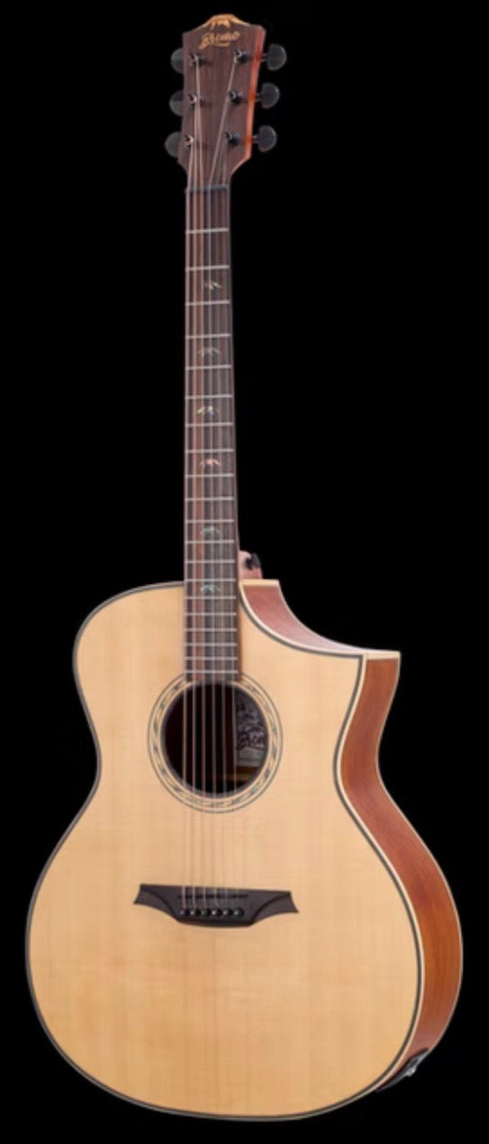 Presenting the Hillside Auditorium C guitar, boasting a scale of 648 mm (25 1/2") and a Nut Width of 43 mm (1 11/16"), offering exceptional comfort and playability. The Solid Spruce top, fortified with patented 'ToneFlow' bracing, combined with Mahogany back & sides, delivers a balanced and resonant sound profile. Maple multi-layer body binding and Rosewood purfling complement the body design, while the Amara Ebony fingerboard showcases the distinguished Mt. Bromo Abalone inlays. Detailed 'Cowboy Rope' and 'Eagle Wing' adornments enhance both the soundhole and bridge, adding aesthetic appeal and functionality. Additionally, equipped with a Nubone XB nut & saddle, diecast machine heads, and a satin finish, this guitar offers premium craftsmanship. Featuring a 3-Band EQ Preamp, the 'Bromo' BZP1 electronics ensure versatility and exceptional amplification for an all-around stellar performance.
