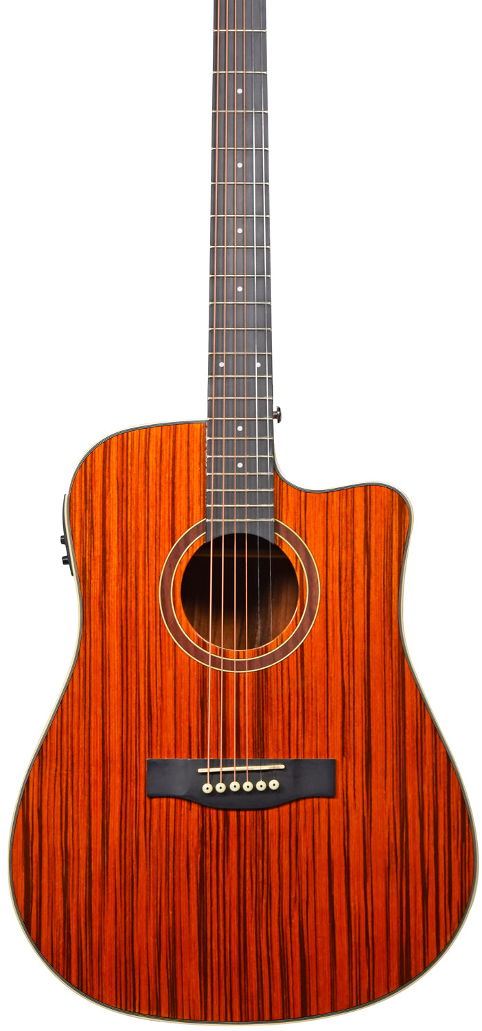 Dreadnought style electro-acoustic guitar with a venetian cutaway. Fitted with a 3-band active EQ and inbuilt tuner. The body is constructed from figured wood laminates in a high gloss finish to accentuate the attractive woodgrain. The Okoume neck holds an HPL fingerboard with 20 low profile frets. In addition to its natural good looks, the Sundown guitar is an eminently playable guitar with pro-level features for live performances, studio sessions and songwriting.