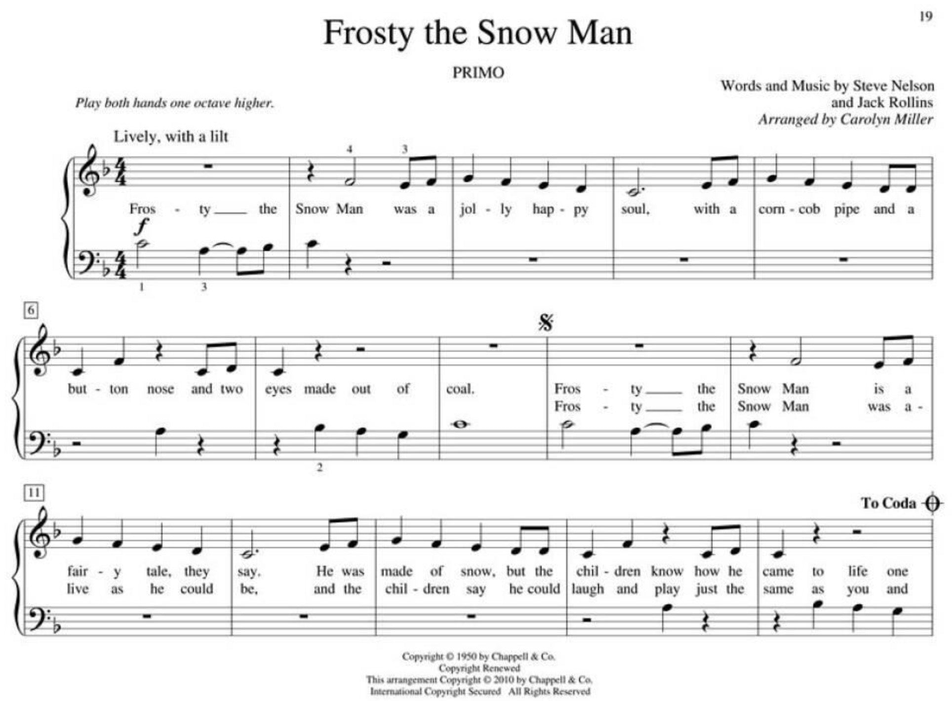 Eight joyful Christmas tunes arranged as equal-level elementary piano duets: Believe · C-H-R-I-S-T-M-A-S · Do You Hear What I Hear · Frosty the Snow Man · Here Comes Santa Claus (Right Down Santa Claus Lane) · I Saw Mommy Kissing Santa Claus · The Most Wonderful Day of the Year · Nuttin' for Christmas.