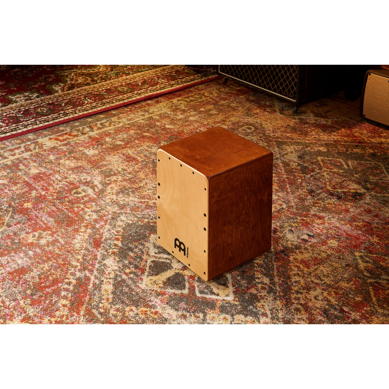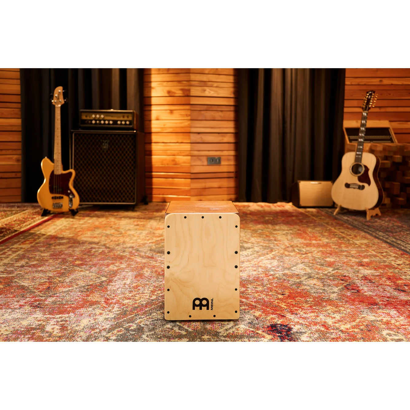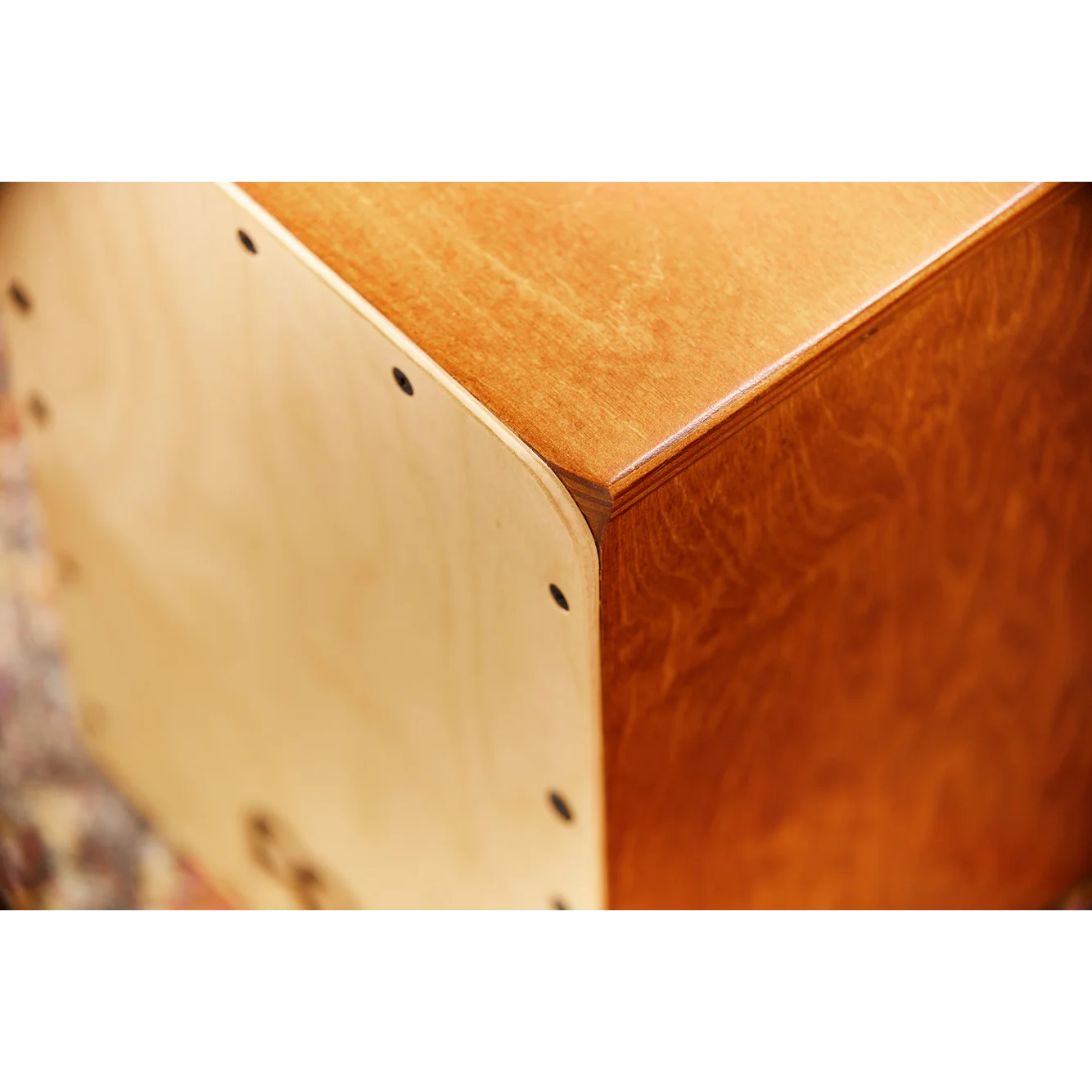 The MEINL Jam Cajon with fixed internal snares is perfect for playing on the go. Its compact design is lightweight and easy to carry to drum circles or acoustic gigs. Crafted in Europe from Baltic birch wood, the Jam Cajon has great low end punch when played near the center and dishes out snare drum "slap" sounds when striking the top corners of the playing surface. The dual internal snares are fitted to rest against the inside of the frontplate for a sensitive response. These sounds are perfect for providing the rhythmic foundation for acoustic music.