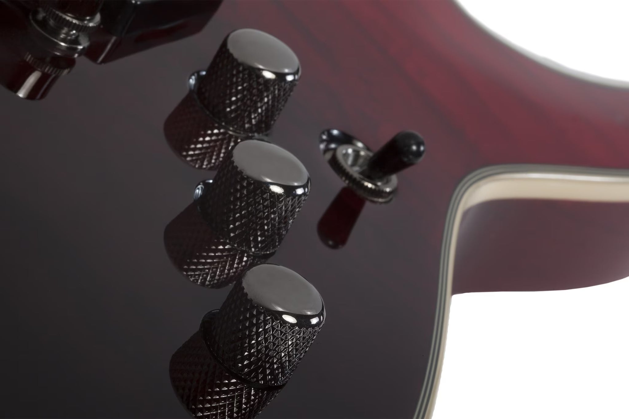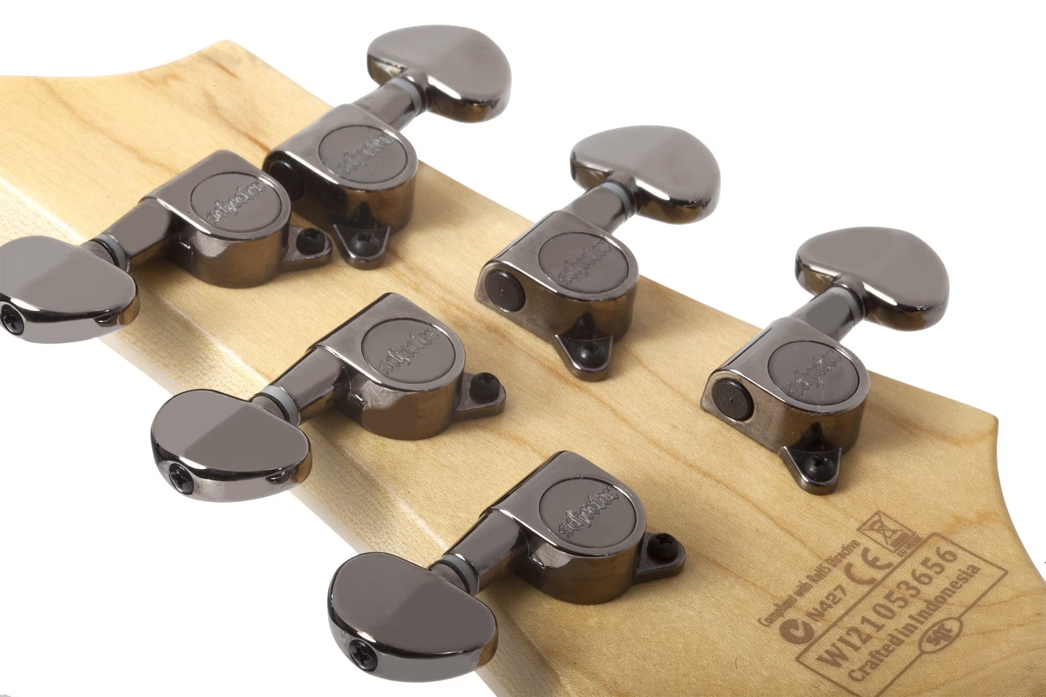 The Schecter 2034 Omen Extreme-6 delivers professional-grade performance in a striking S-style package. Built with a mahogany body topped in quilted maple and finished in eye-catching Blood Burst, this guitar combines visual appeal with serious playability. The thin "C" maple neck and 24 X-jumbo frets enable fast, comfortable playing across the full fingerboard, while the 14" radius rosewood board suits both lead work and smooth bends. Equipped with a Schecter Diamond Plus bridge pickup, Tune-O-Matic bridge with string-thru body design, and black chrome hardware, this right-handed six-string offers excellent tonal clarity and sustain. The Graph Tech XL Black Tusq nut and 2-way adjustable truss rod ensure reliable tuning stability and setup flexibility. Perfect for players seeking quality construction and distinctive aesthetics.