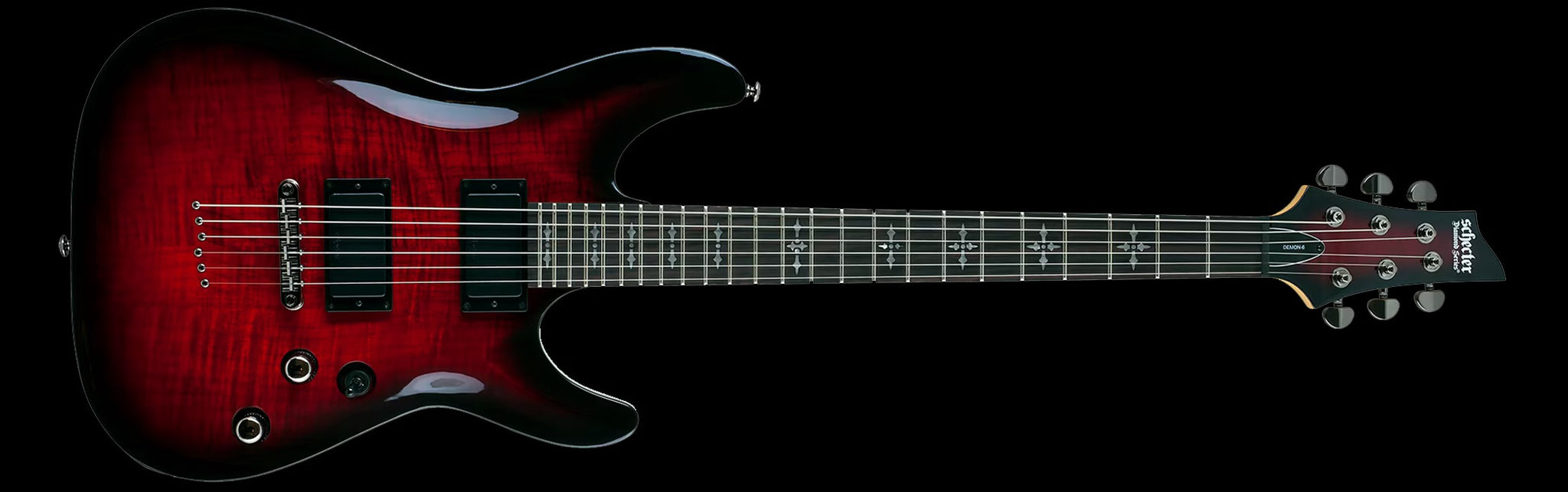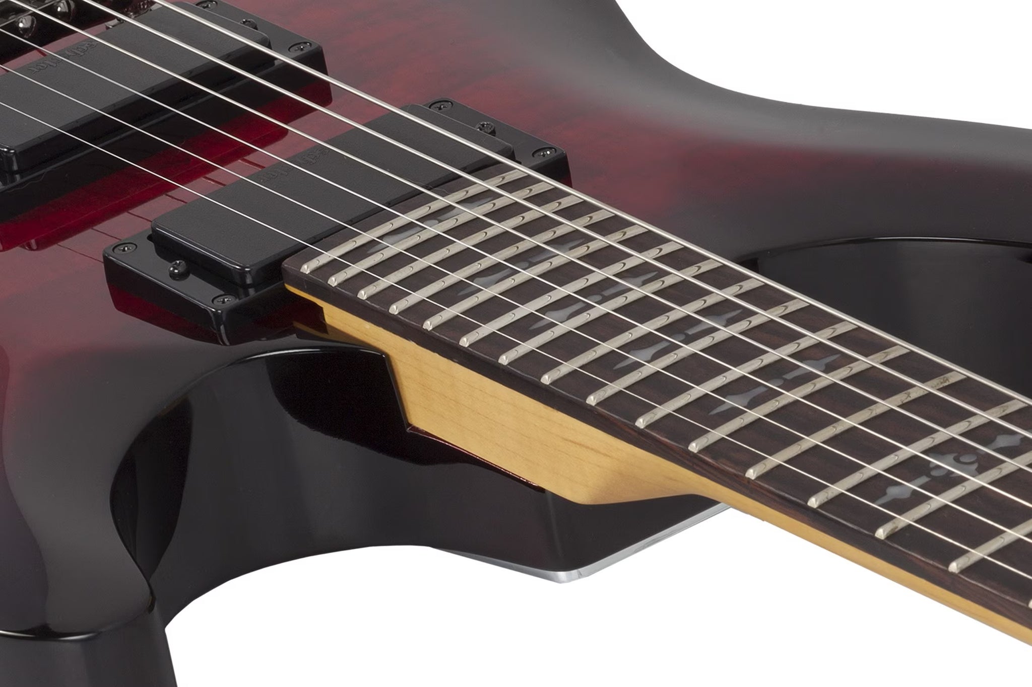 The Schecter Demon-6 delivers professional-grade performance in a striking S-style package. Built on a resonant basswood body with a gloss finish, this right-handed electric features a slim maple neck with a comfortable thin "C" profile and 24 X-Jumbo frets for effortless playability across its 25.5" scale. The rosewood fingerboard showcases distinctive grey pearloid Gothic cross inlays, while the Graph Tech XL Black Tusq nut ensures superior tuning stability. Dual Schecter Active pickups provide punchy, articulate tones with excellent clarity and sustain. The Tune-O-Matic bridge with string-through body design optimises resonance, whilst black chrome hardware and metal knurled controls complete this versatile instrument. A 2-way adjustable truss rod allows for precise neck adjustment.